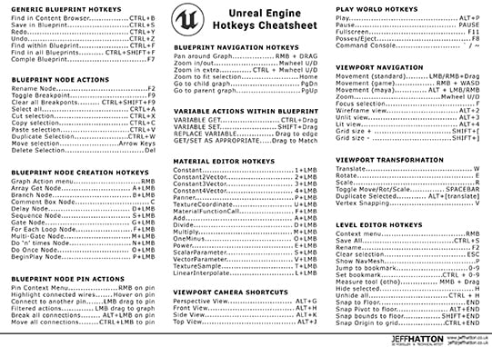 Packed full of useful hotkey shortcuts for use in viewports, blueprints, material editors, level editors, cameras and general use